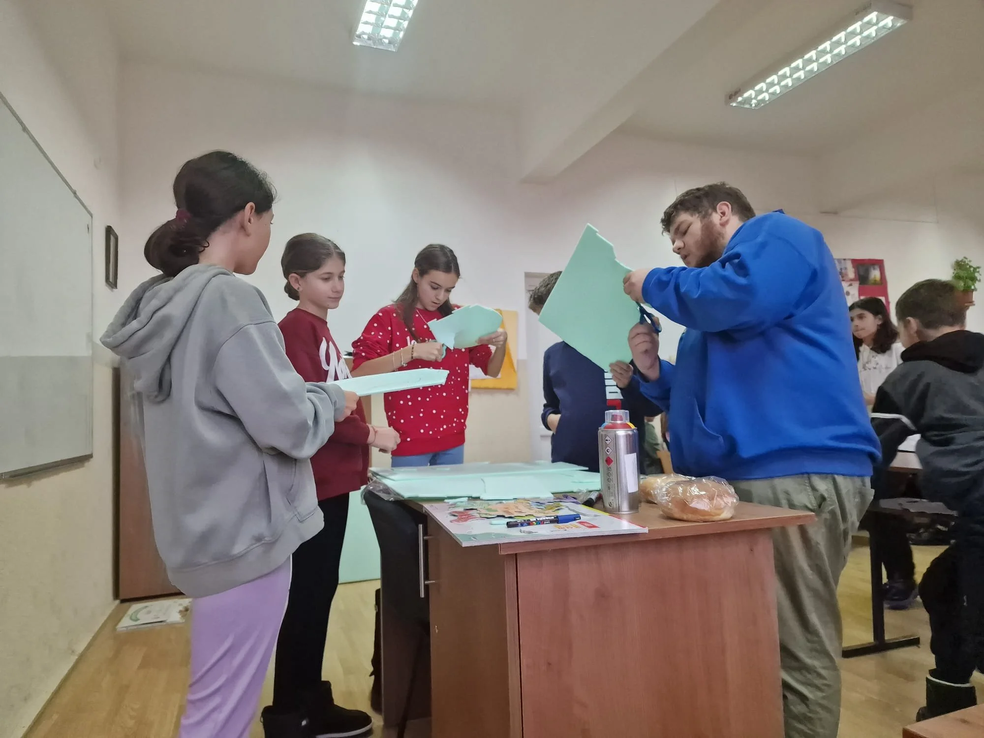 Foto: Echipe de elevi decupează obiecte pentru a rezolva o problemă de matematică (arhivă personală)