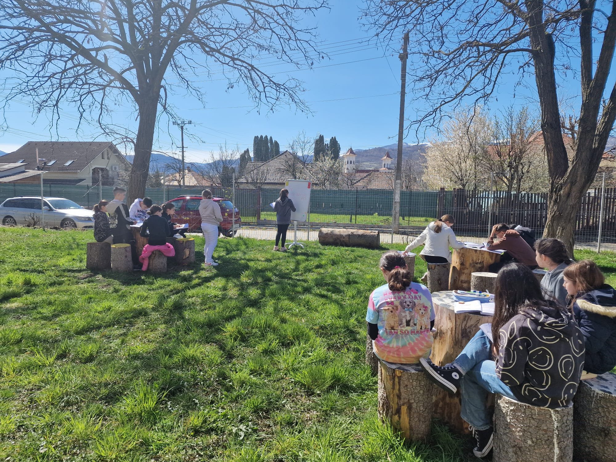 Foto: Elevi lucrând în curtea școlii la ora de matematică (arhivă personală)